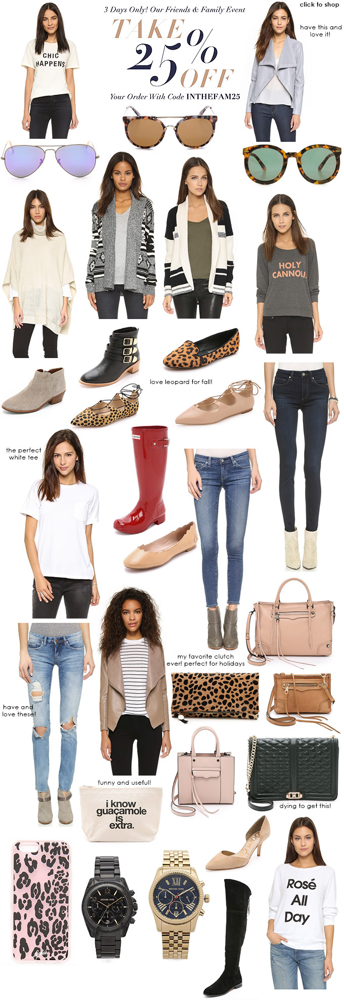 Besides the Nordstrom sale, the Shopbop Friends and Family Sale is my favorite sale of the year. Everything, minus a few exclusions, is 25% off with the code ‘inthefam25’. Plus it’s free shipping! This is a great time to stock up on that favorite handbag of yours, shoes or even accessories. There are so many handbags on sale this year… I am dying to get this one! I also really want this watch and this little pouch… how cute is it?