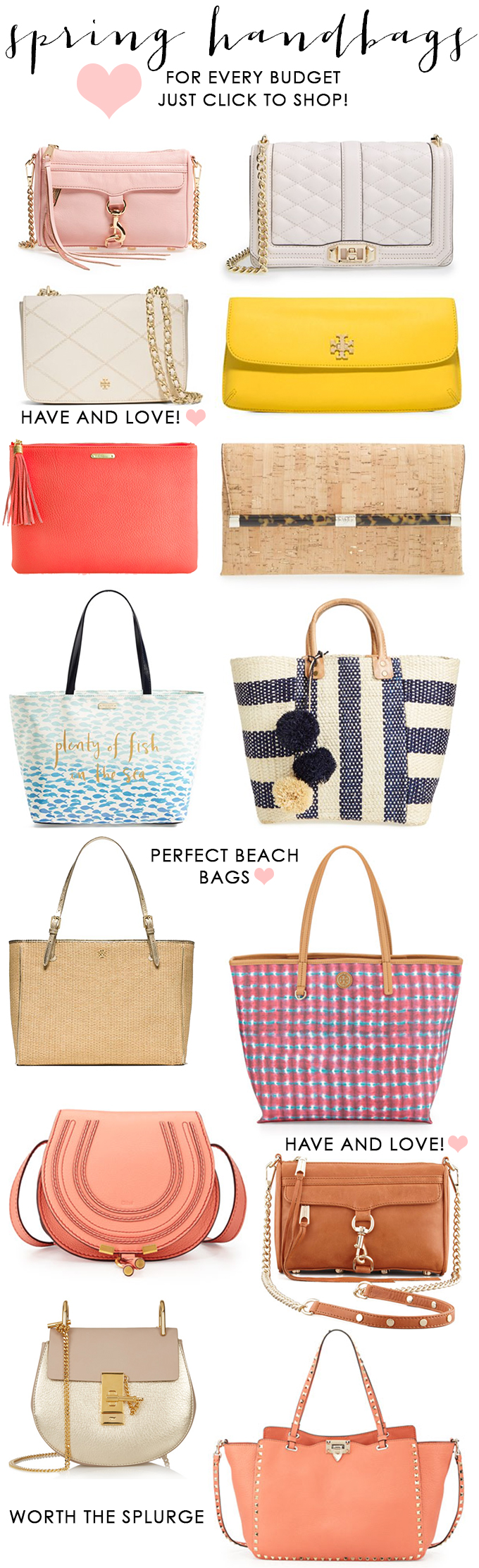Happy Sunday! I’ve been asked by a few friends to put together a spring handbag guide, so I decided to do that to brighten up your Sunday afternoon/evening! There are so many great options here, and I made sure to include some at higher price points {great investment pieces} and some at lower price points. I’m absolutely obsessing over this and this. I just purchased the two of them and have worn them nonstop! I love that they go with everything. Also, I’m currently obsessing over coral so this tote and this cross body are perfect investment pieces for the spring, summer and even fall! I’ve seen all of these in person and they are completely worth it. I always find it essential to invest in 2-3 purses per season {or per two seasons}. You’re always wearing a bag and you want to make sure it brings that statement to your outfit. Also, it’s important to make sure that it fits the essentials, and a little more! Haha. The straw bags in the guide above are perfect bags and won’t break the bank. Oh, and can we talk about this beauty? This style is definitely the new IT bag for this year. I can’t wait to get my hands on one!