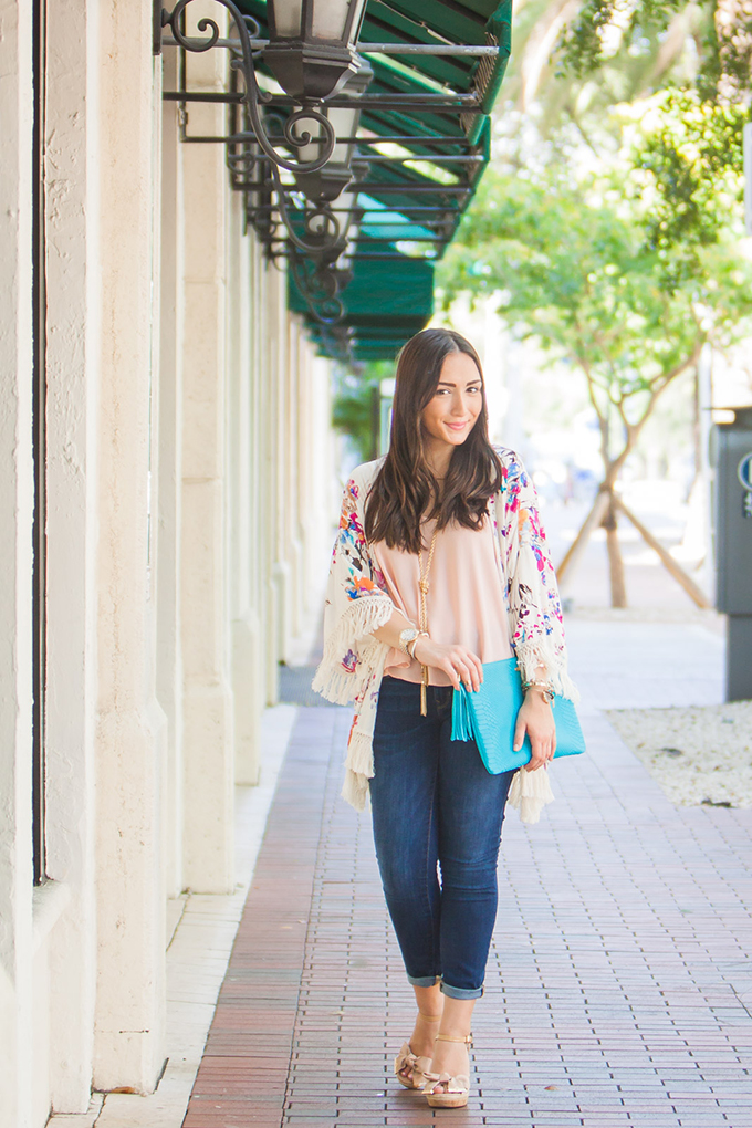 Thurs-yay is the new Fri-yay! I’m loving this floral kimono and all of its colors and am really excited about the fact that I can finally bring out my aqua clutch again! I am spring ready! So you can get an idea of the extreme heat Miami has been having, my hair was curled 1 hour before we shot this outfit… clearly, it’s been insanely hot and humid. So pardon if I look flushed in these photos because I was about to jump into the nearest fountain filled with cold water! Haha. My favorite wedges are back in black and I’m loving them! If you want something closer to the color I’m wearing, these and these are also great options. Have a great day and thanks for reading!