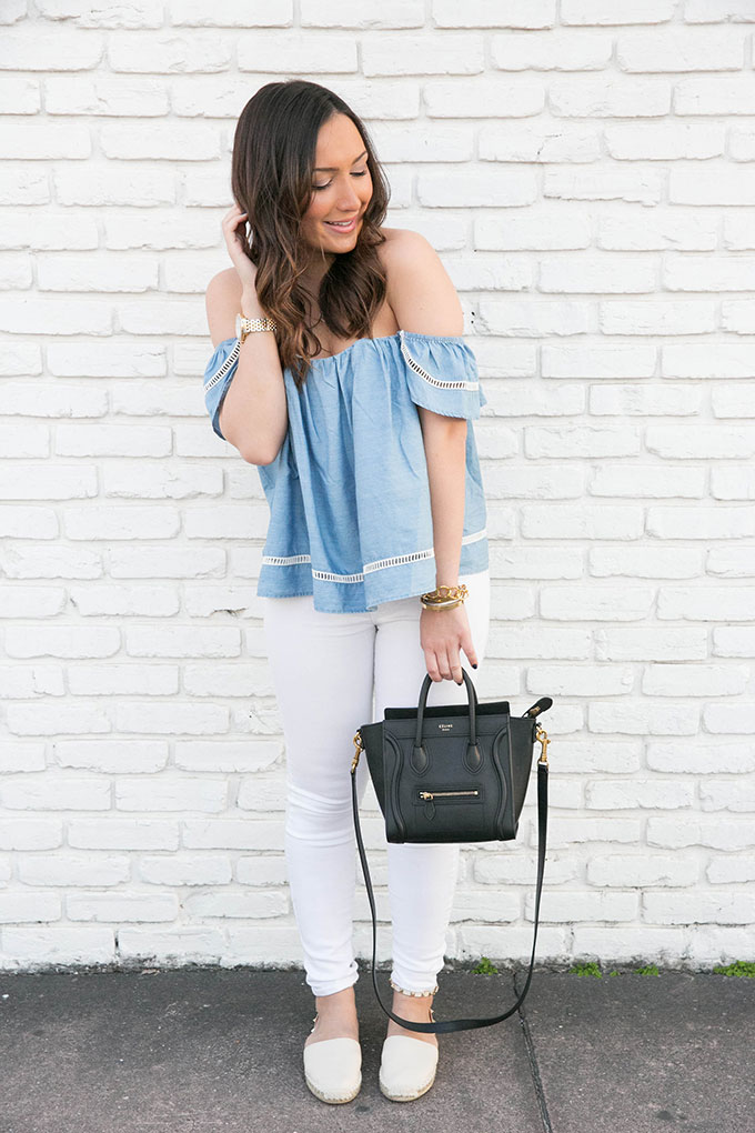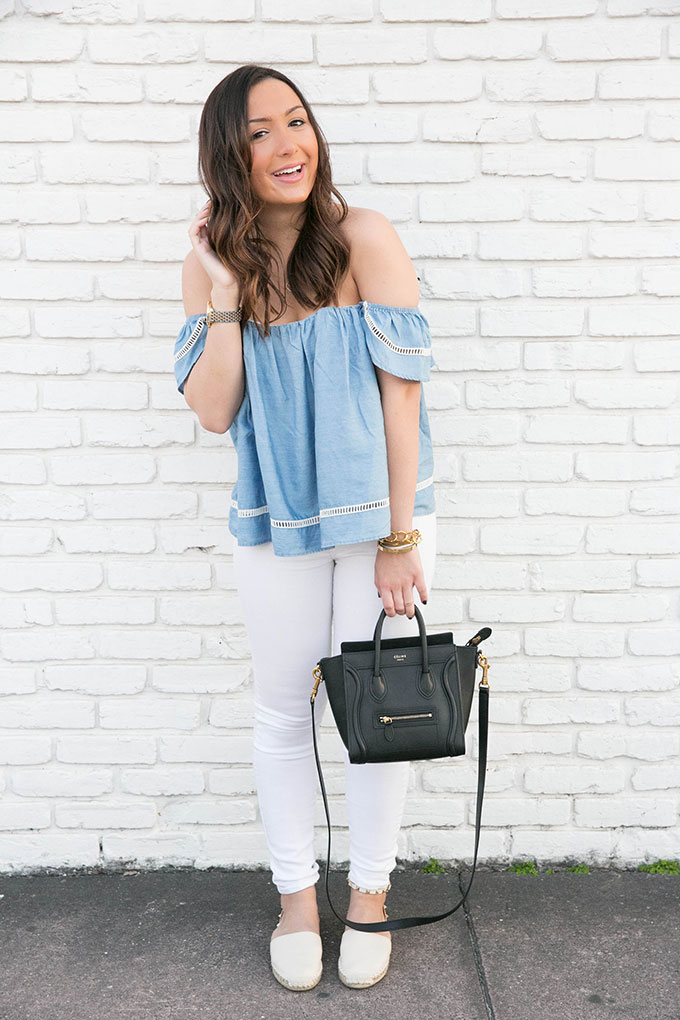 Happy humpday! It’s almost Friday and I’m so excited because I have spring break next week. And I’m going to Austin with my mom! I’ve never gone to Texas so this will be a really fun experience for the both of us. Today I’m sharing one of my favorite outfits-to-date. This top is seriously one of my favorites. I love that it is the quintessential spring top and has such a soft chambray material. There are very few left so I’ll link some of my favorite off-the-shoulder tops below. Clearly that is the theme of this week’s posts! Haha! They have mine in this color here. I love it.