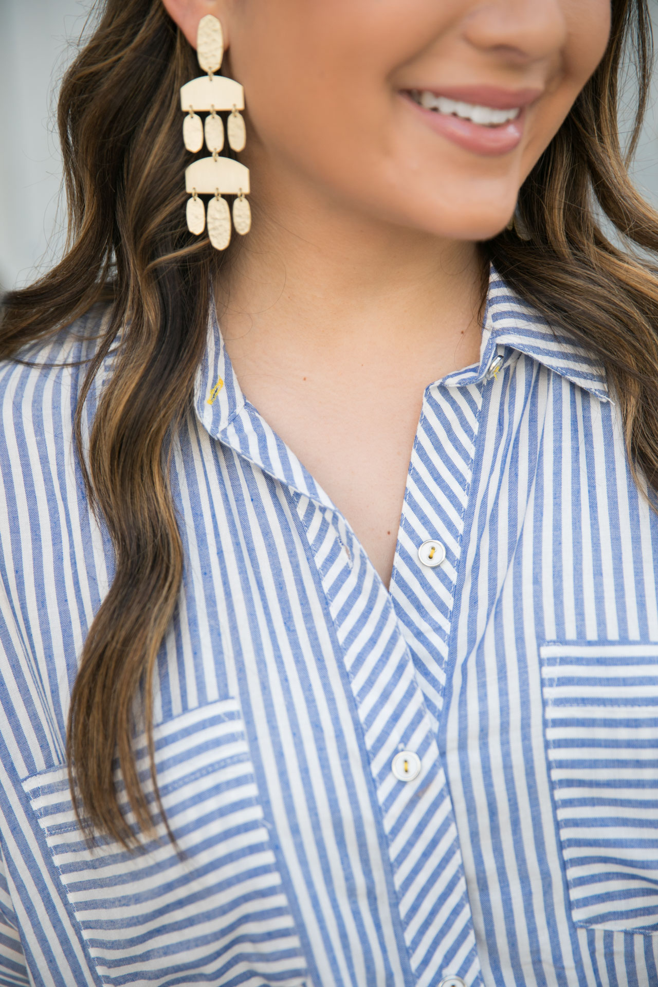 I paired it with white jeans and my favorite statement earrings for a look that would be perfect for brunch with the girls or a family lunch. If you want to dress it up more, you could do the same earrings but instead wear black high-waisted denim and heels. I’m telling you, guys, this top is the best. I also wanted to give a quick shoutout to these earrings. While they are at a higher price point, I’ve worn them with just about every outfit imaginable. They’re lightweight and I love that they add a little bit of glam to anything you wear without being too overbearing. I’m surprised at how much I’ve been wearing them since I’m usually a stud kind of gal.