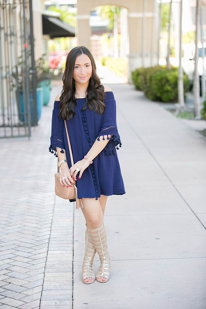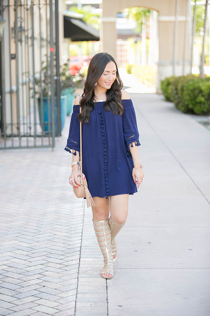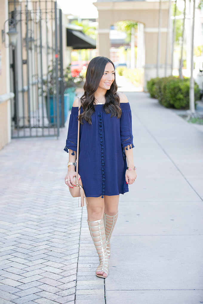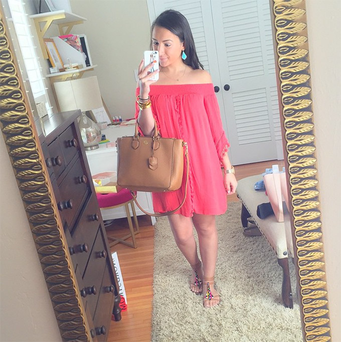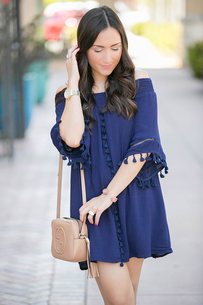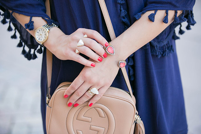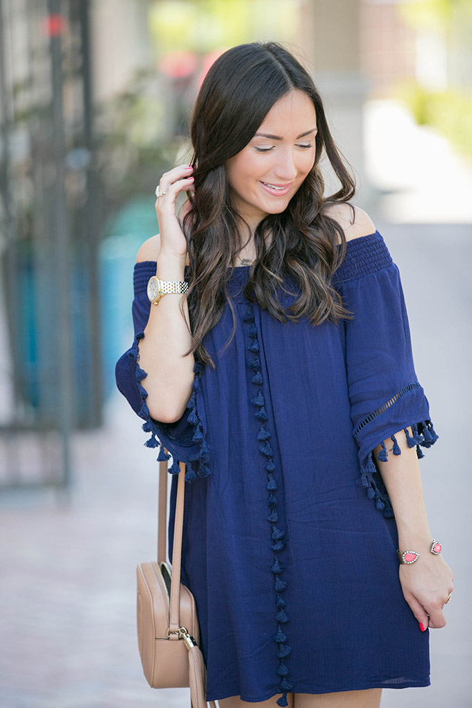 This is hands down my favorite dress I’ve ever owned. Yet again, I bought it in two colors. I absolutely love the coral mixed with these earrings in turquoise. That’s one of my favorite color combos! When I was ordering it online, I was a bit hesitant because I thought it might be a little long on me, since I’m only 5’3. But I ordered the small and it fits great! There’s something about a tassel dress that just screams perfection. I love the navy because it’ll work well when I have a tan (hopefully I’ll be able to get out and get some sun, soon…with protection of course!) and I love the coral because it’s such a fun pop of color.