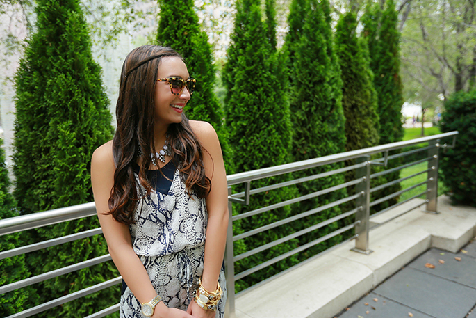 Jumpsuit: Prinzzesa Boutique (LOVE this one) | Shoes: Sam Edelman | Purse: Louis Vuitton | Necklace: Baby Frou Frou c/o (also available here) | Sunnies: Prada (love this less expensive version) | Bracelets: H.M. Willow | Watch: Michele | Lips: Dior Addict Lipstick