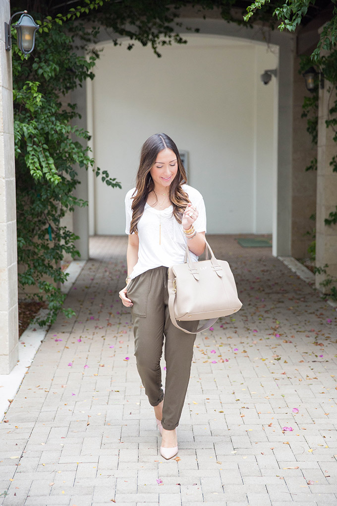 I had been on the search for a good pair of olive pants for a while. I bought some, returned some, and kept looking until I found these! I love that they’re slouchy without being too slouchy, are super comfortable, light and don’t get saggy in the wrong areas (if that makes any sense). I’m honestly so happy with them and can see them pairing with so much in future posts! I wanted to keep it casual today with this white tee, which is so comfortable you wouldn’t even believe it’s not a pajama… haha! It comes in three colors and will definitely be a closet staple for the everyday girl. I love to have at least 5-10 white tees in my closet. While that may sound crazy, I wear them so much.