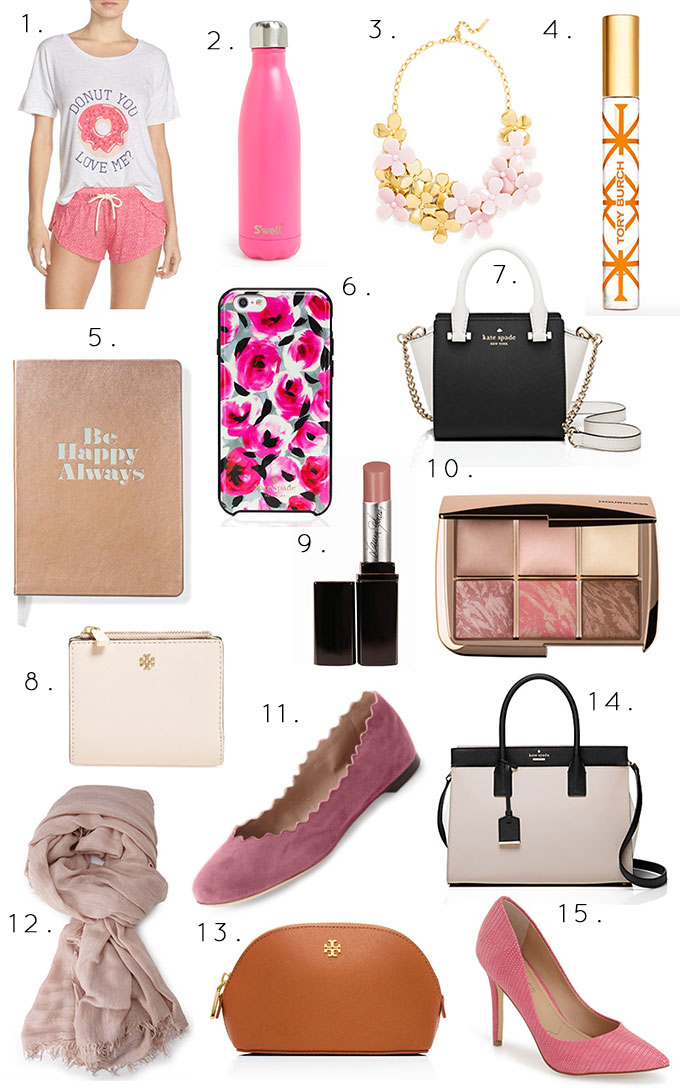 1. Pajamas | 2. Water bottle | 3. Statement necklace | 4. Rollerball perfume | 5. Journal | 6. iPhone case | 7. Small Kate Spade tote | 8. Tory Burch mini wallet | 9. Laura Mercier lip parfait | 10. Ambient palette | 11. Scalloped flats | 12. Blush scarf | 13. Cosmetic case | 14. Tote | 15. Pink pumps