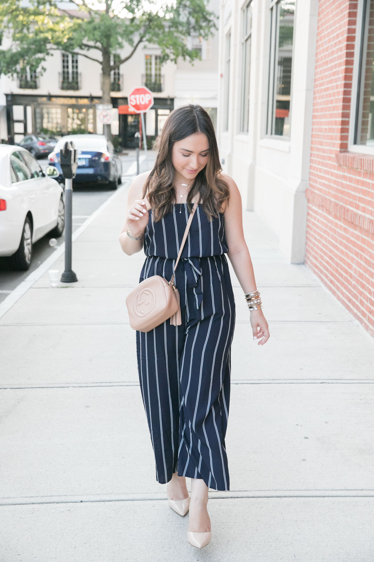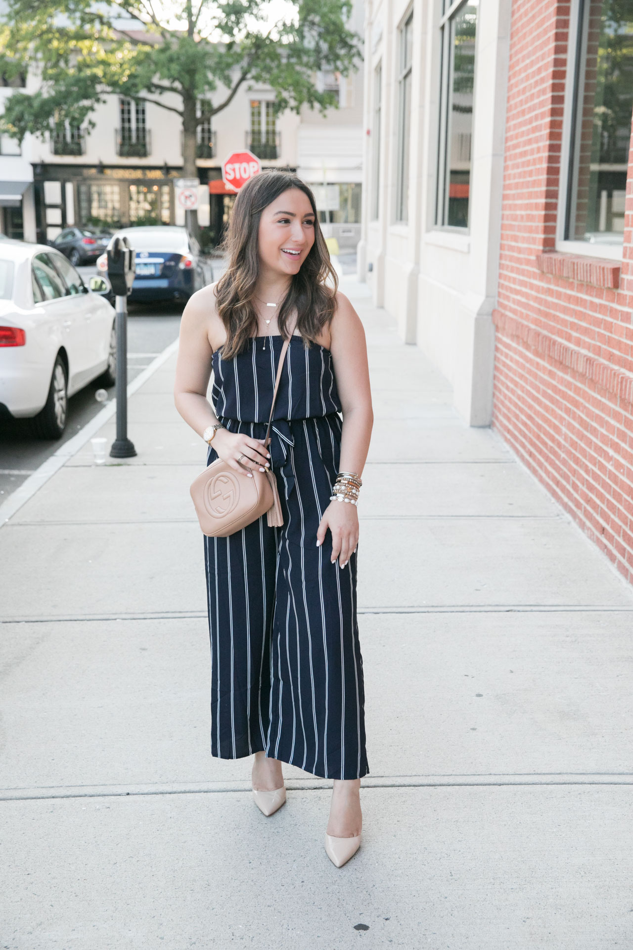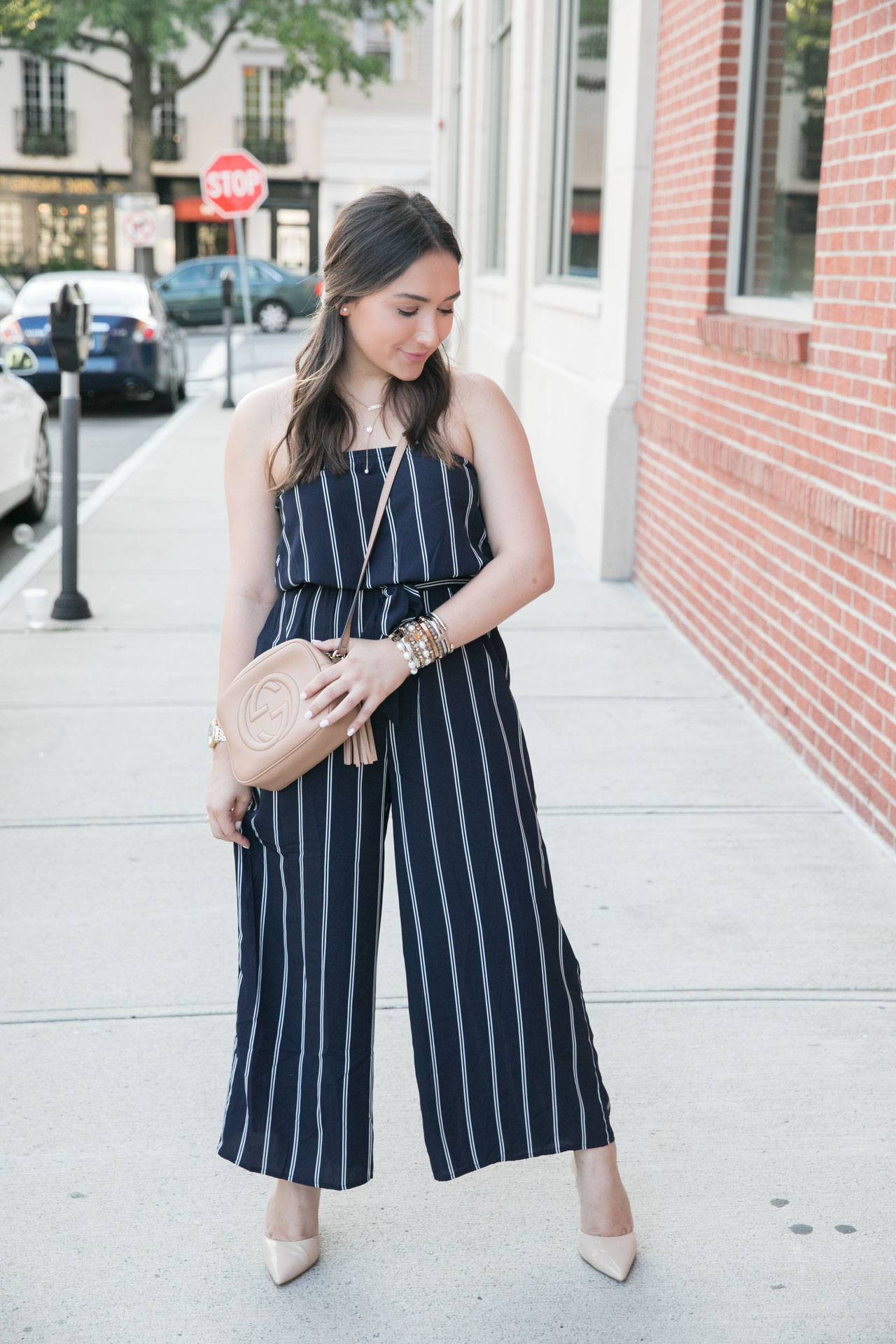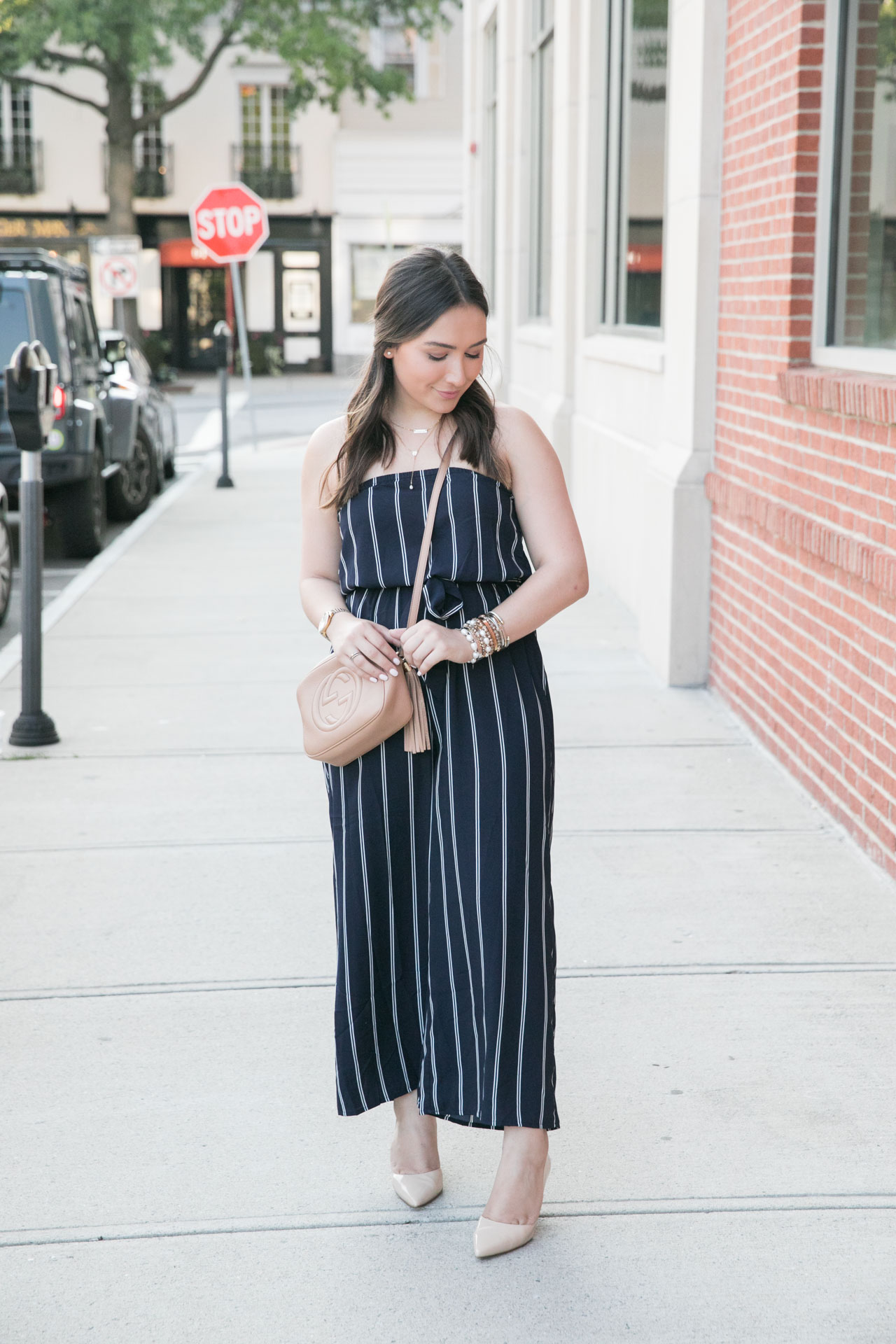 It’s only $52 and is such great quality. For a comfortable fit, I’m wearing a medium and it’s perfect (it did take me a few seconds to get over my butt, but hey – I’m Cuban). What I love the most about this strapless jumpsuit is that it fits well for petite gals like me! While I’m only 5’3, I feel like this fell perfectly and it would also look great if you’re taller, too. I also love that the stripes are vertical because they make you look longer rather than wider.