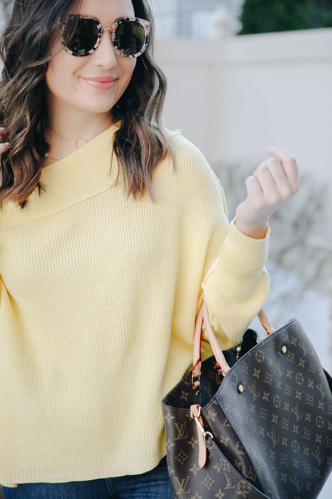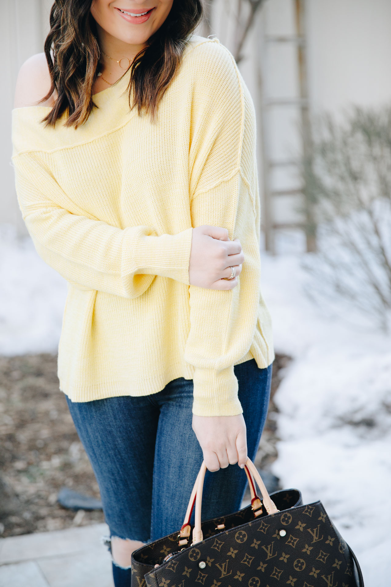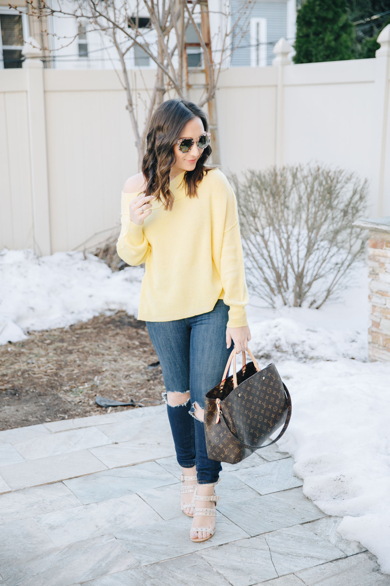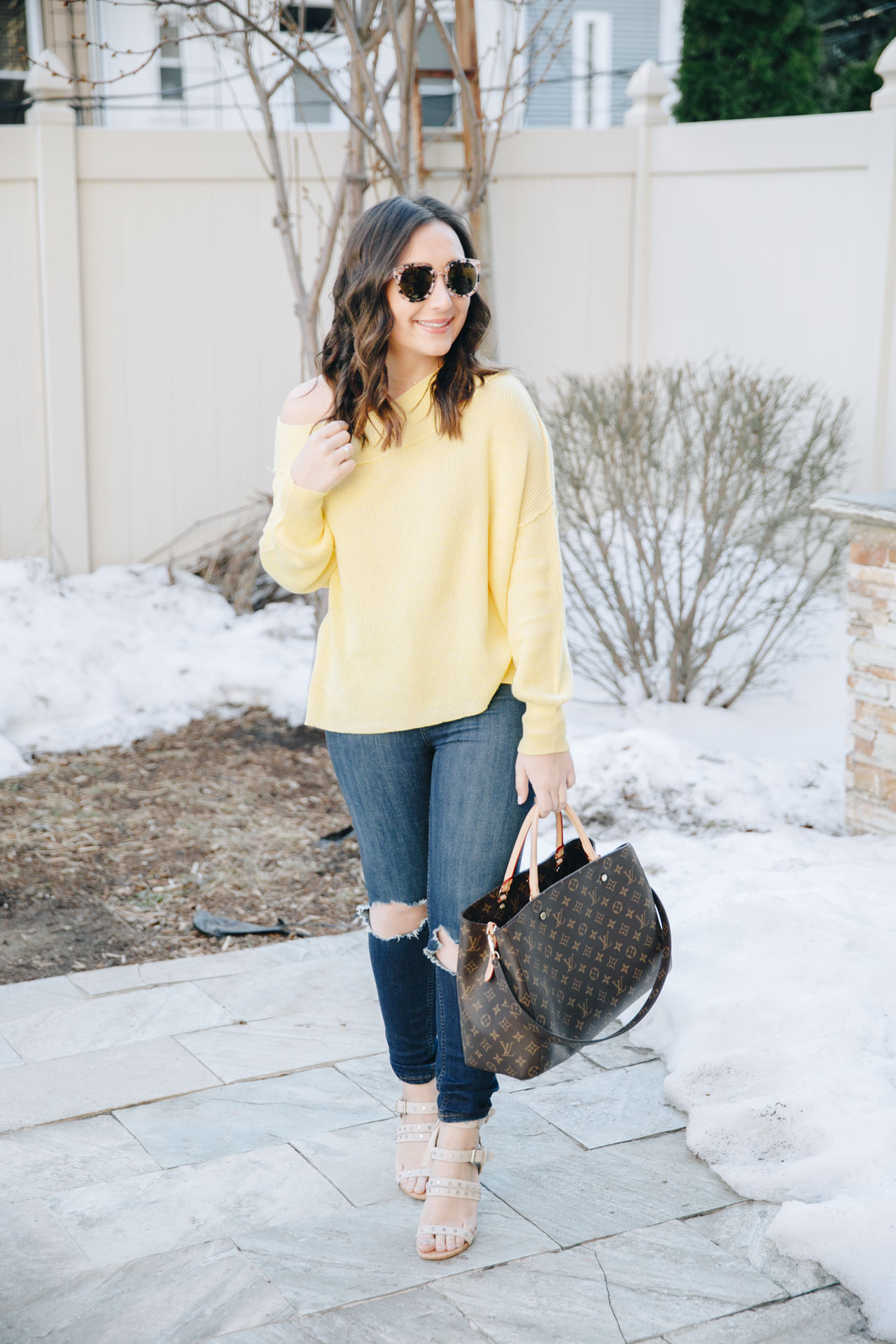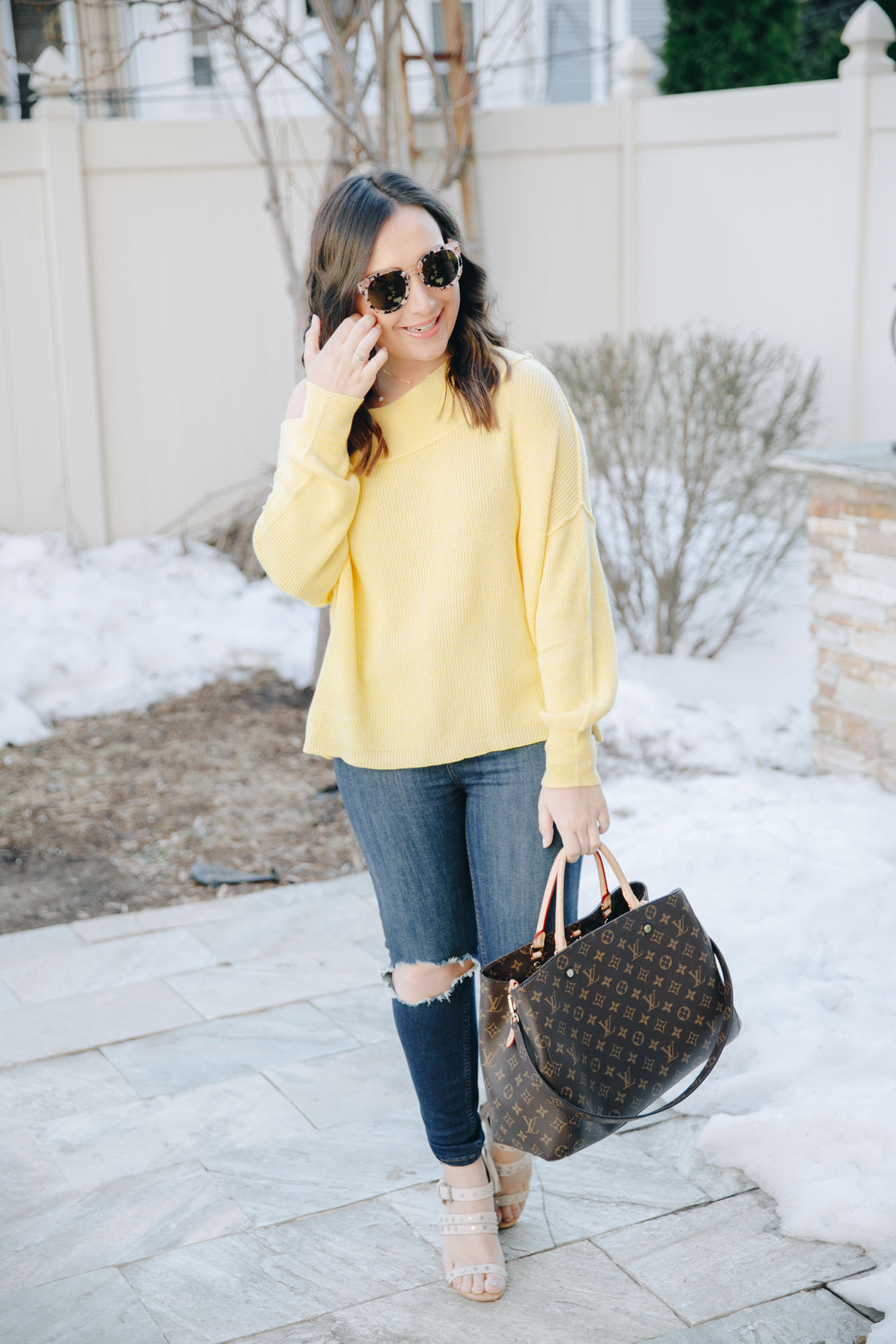 Happy spring! I thought I would add a little color to your Monday with this yellow pullover. I also have it in grey and beige but knew I needed the yellow as soon as I saw it! When I used to be tan, yellow was my favorite color to sport. But, I’m a little white now…needless to say, haha! It’s such a comfortable pullover and the yellow color is so fun for spring (especially with white jeans!).